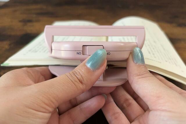 使い方は簡単で、クリップ部分を好きな場所に挟んで、クリップ上部にあるスイッチをオンの方向にスライドさせるだけ。たったこれだけで、内蔵のLEDライトがふわっと点灯し、ページを優しく照らしてくれます。