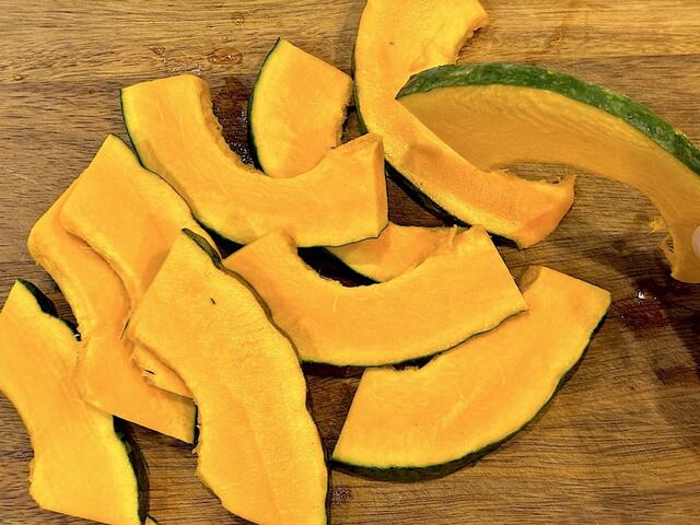 1. かぼちゃは種とわたを取り除き、7〜8mm厚さにスライスする。硬くて切りにくい場合は全体をラップで包んでレンジで2分ほどチンして少し柔らかくするとカットしやすくなる。