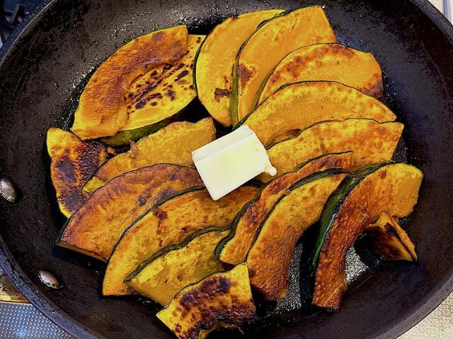 3. かぼちゃに火が通ったら、バターを入れて溶かしながら絡め、塩を振る。