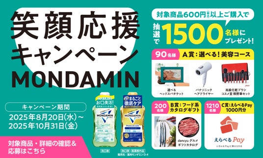 ブランドリニューアルを記念して2025年8月20日(水)から2025年10月31日(金)まで、「笑顔応援キャンペーンMONDAMIN」を実施中です。対象のモンダミン製品を600円(税込)以上ご購入の上、レシートでご応募いただいた方の中から、抽選で総計1,500名様に “笑顔になれる” 豪華景品をプレゼントいたします。詳しくは、キャンペーンページをご覧ください。