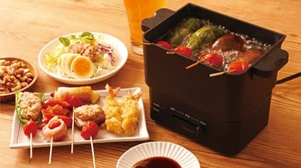 新製品は、累計出荷台数1万8千台を突破した初代「おひとりさま用フライヤー『カラリ』」の後継モデル。串揚げに便利なソケットや、油切りスペース一体型で油はねを防ぐドーム形状のフタなど、構造面で改良を加えている。