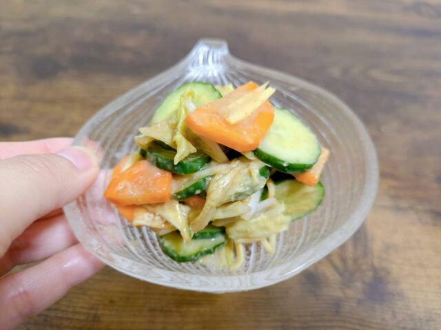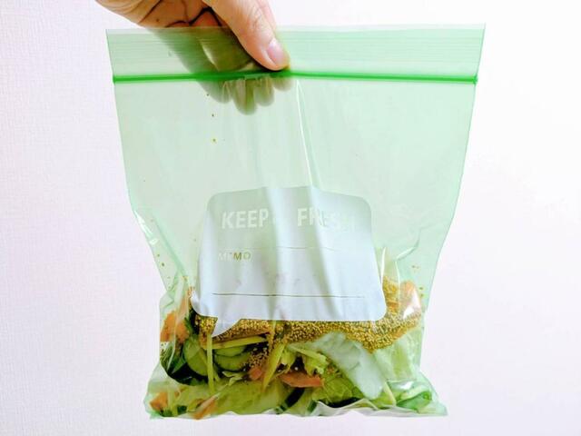 ジッパー付きの袋に薄くカットした野菜(きゅうり、白菜、にんじん)を入れて、千切りしょうがを加え、顆粒みそをふりかけたら揉み込んで待つこと15分。