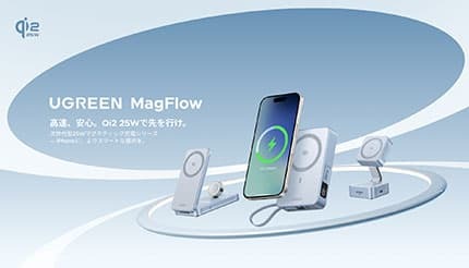 ユーグリーン・ジャパン(UGREEN)は、最新の「Qi2 25W」規格に対応した次世代ワイヤレス充電シリーズの新製品として、「UGREEN MagFlow マグネット式モバイルバッテリー 10000mAh 25W」「UGREEN MagFlow 3-in-1 マグネット式 ワイヤレス充電器 25W」「UGREEN MagFlow 2-in-1 マグネット式ワイヤレス充電器 25W」の3機種を、公式オンラインショップ、Amazon.co.jp、楽天市場、ヨドバシカメラ、ビックカメラで9月5日に発売した。