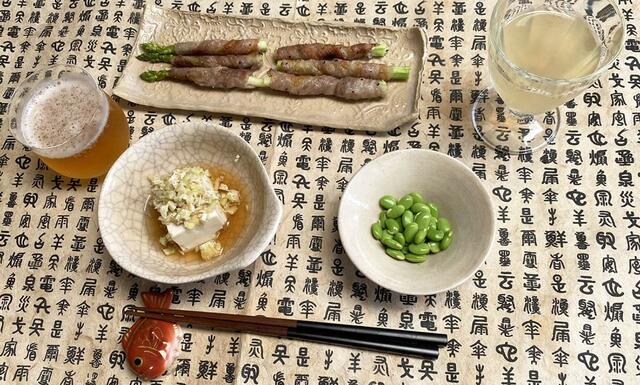 冷奴(茗荷、生姜、ネギ、めんつゆ、酢)、枝豆、アスパラの豚バラ巻き焼き、トマトエキス。
