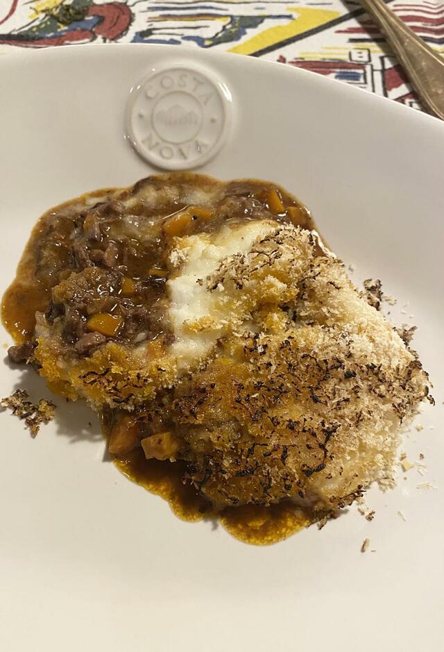 昨日の昼に食べた「牛肉の赤ワイン煮」はまだ残っていたので、牛肉を細かく切って、バターで炒めた玉ねぎと人参を混ぜ、ブルギニョンソースとも混ぜ、耐熱器に入れる。マッシュポテト、パン粉、パルミジャーノを重ねる。180℃に熱したオーブンで15分。「牛肉とマッシュポテトのグラタン= hachis parmentier 」ができました。