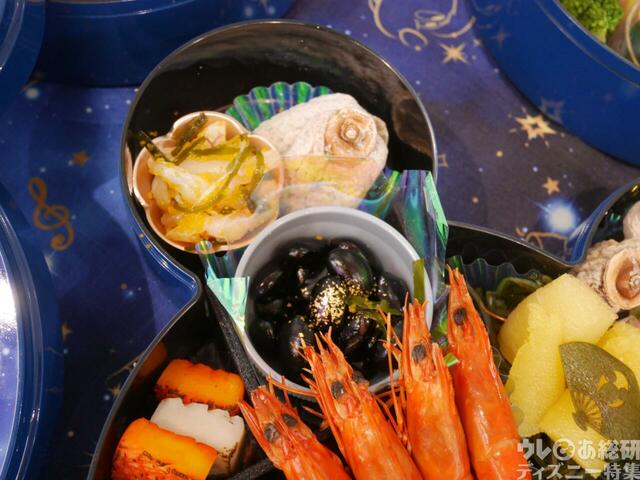 シュリンプカクテル風のおかずや、生ハム&キャロットラペ、ハムとチーズの枝豆テリーヌなど、洋風のおかずもたくさん盛り込まれており、最後まで飽きずに楽しく食べ進める事ができますよ。