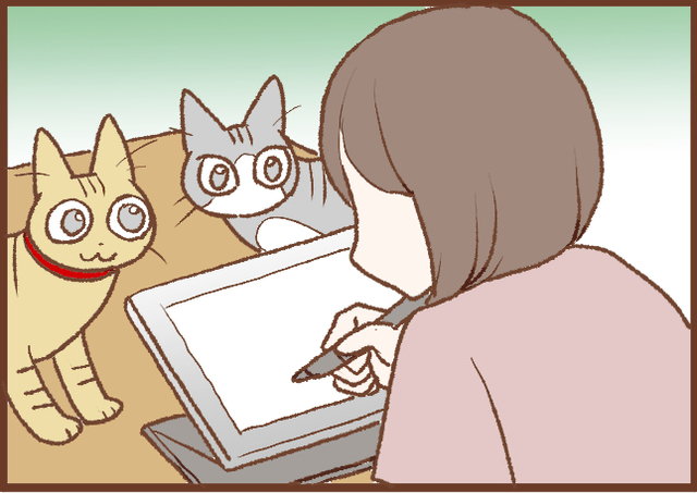 それまでは基本的には自分の作業スペースにある液タブ(絵を描くためのモニター)の前にいたので、リビングで仕事ができる!っていうのはかなり大きかったのです!!!が……まあ……なんか……猫めっちゃ来る……っていう(笑)