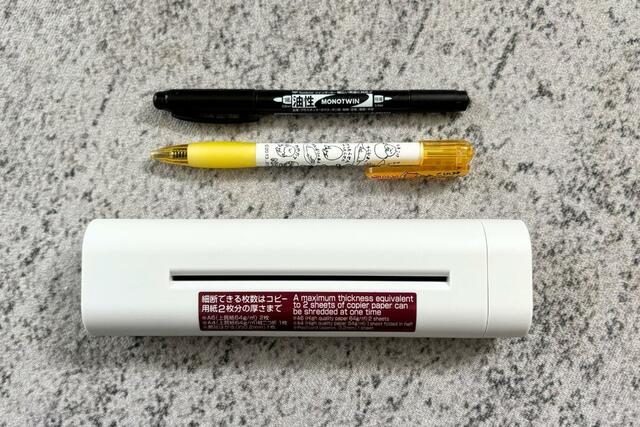 ボールペンやサインペンと比べてみるとこの通り。電動の大きなシュレッダーしか見たことがなかった筆者にとっては、衝撃の小ささでした。