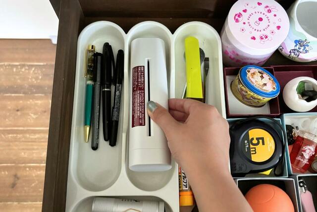 引き出しや本棚の隙間にスッと収まるサイズ感がgood! 筆者は引き出しの中に入れているペントレーの1箇所を専用の収納場所にしています。