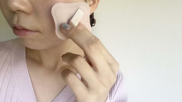 つづいて、リキッドファンデーション。パフに少しリキッドを乗せ、肌になじませていくと……いつもよりも少量で肌をカバーできました!
