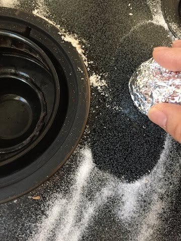 粉末のクレンザーなどを振りかけるといいと書いてありますが、私は重曹でやってみました。水分を少し足すと、汚れが落ちやすいですよ。軽くこするだけで、けっこう落ちました! すごい!!