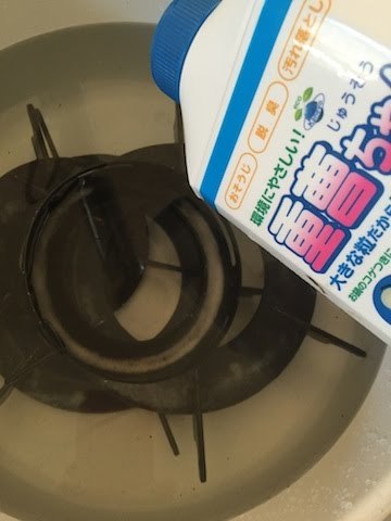 ガスコンロのゴトクのお掃除もお忘れなく。私の場合、水に入れて重曹を振りかけて置いておきます。そうすると、焦げ付いた汚れも落ちやすくなります。重曹は本当に万能なので、かなりおすすめです!