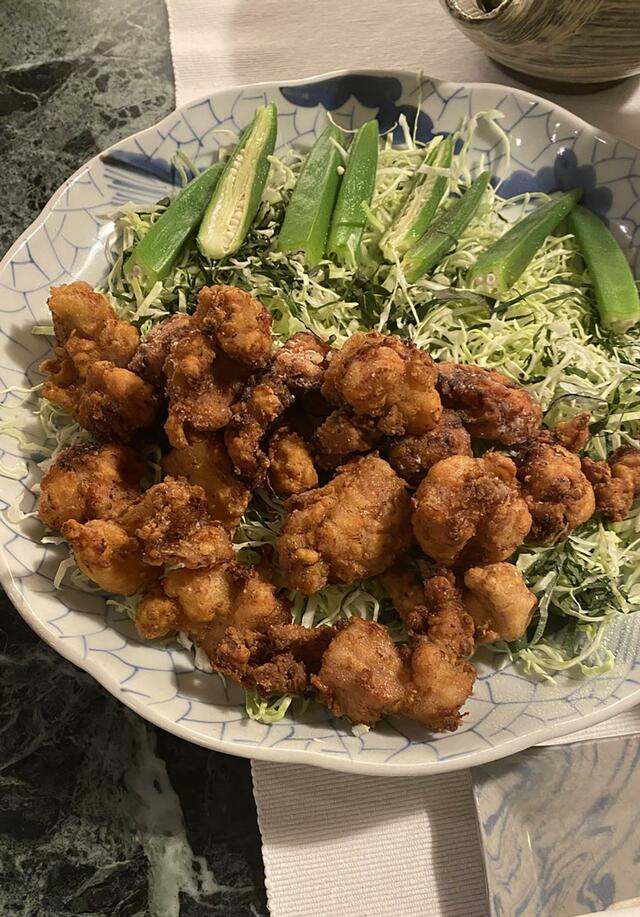 鶏のから揚げ(オクラ、キャベツ、大葉)、