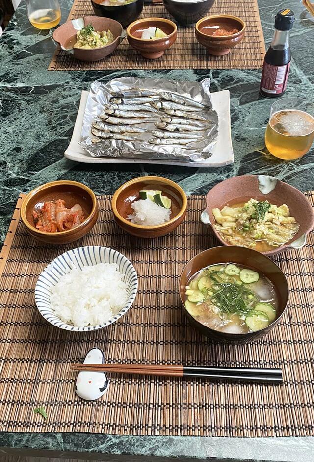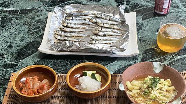 めざし(小さいの)22尾を食べきりました。美味しかった〜!! 白菜キムチ、焼きなす煮浸し、大根おろしとすだち。ごはん、ひや汁(埼玉スタイル)、ビール、