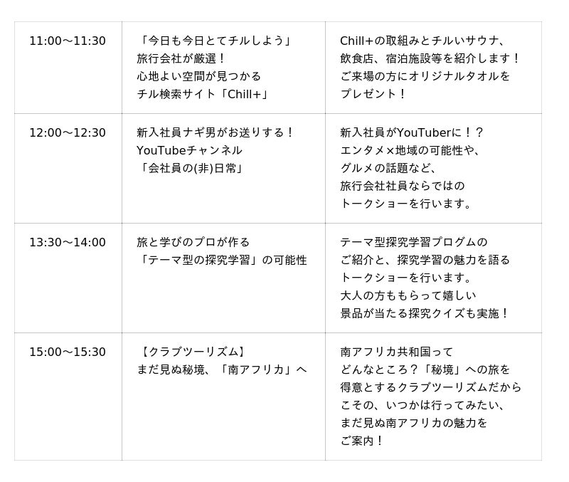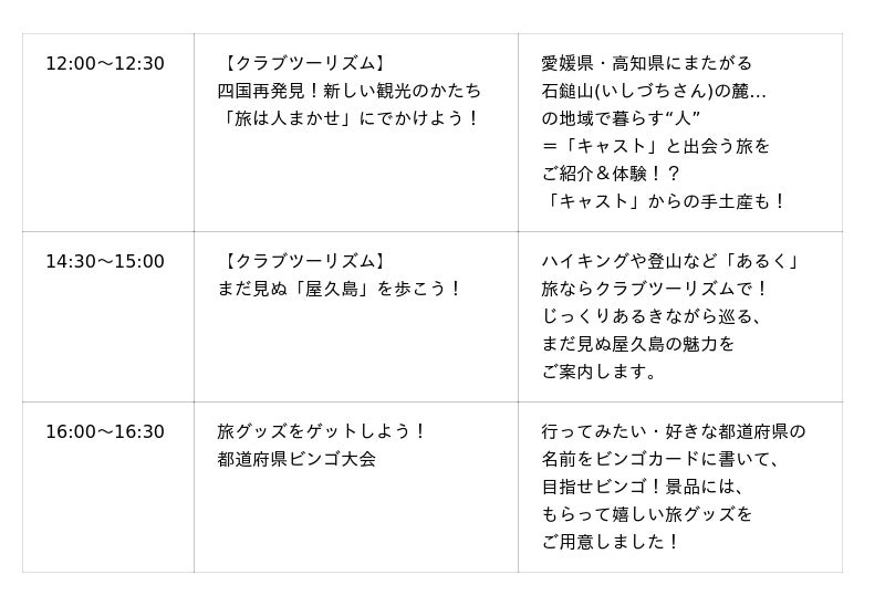 ブース奥ではKNT-CTグループ各社からそれぞれ、一般のお客さま向けにステージを準備いたします。ご参加いただいた方には来場プレゼントや、ビンゴ実施などで嬉しい景品をご用意しております(数量限定)。 座席数に限りがございますので、下記スケジュールをご参照の上、ご来場をお待ちしております。