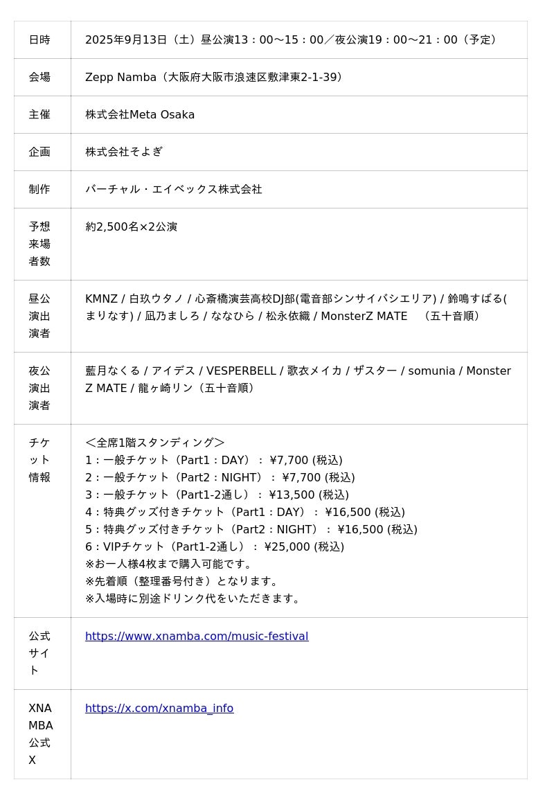 「XNAMBA MUSIC FESTIVAL-2025-」は、YouTube総登録者数280万人超のバーチャルアーティスト15組が集結し、2,500人規模の来場者を動員予定の西日本最大級のバーチャル音楽フェスティバルです。当社が5月に大阪・関西万博で開催した「メタバース・XR・AIアワード」でMeta Osakaが企画し大きな注目を集めた「showcase」の成功を経て、本格的な開催に至りました。