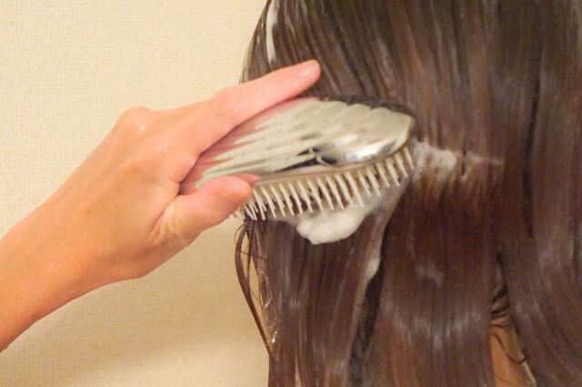 シャンプーをしっかり泡立てた状態で、シャンプーブラシを使い髪と頭皮をブラッシングして、毛の摩擦や絡まりを最少限に押さえつつ、汚れや皮脂を取ります。