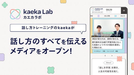 話し方専門メディア「kaeka Lab」は、話し方のジム(R)と呼ばれるkaekaが新たに開設した、誰もが話す力で人生の可能性を切り拓いていくことを目指し、「話し方」に関する最新の情報をお届けする専門メディアです。kaekaは創業以来、経営者や政治家の方をはじめ、幅広い分野の方々に話し方の指導をしてきた話し方トレーニングサービスです。新たに開設する kaeka Labでは、トレーニング現場で培った知見を整理し、広く発信することで、「話し方の学び」を一元的に提供します。