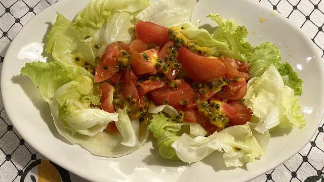 レタスとトマトのサラダにパッションフルーツの中身をプラスしてみたところ、GOOD,GOOD。