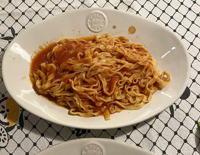 手打ちパスタ(フェットチーネみたいな太さ)とトマト・アラビアータがとっても美味しい。