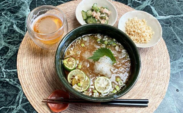 大根おろし素麺(しょうが、ネギ、大葉、すだち、天かす)、あらあら、この食べ方もいいねえ。鮭の水煮缶ときゅうり。