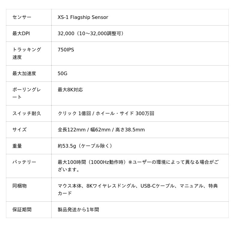 ・Pulsar Gaming Gearsが独自開発した「XS-1センサー」搭載(最大32,000DPI / 750IPS / 50G加速度対応)