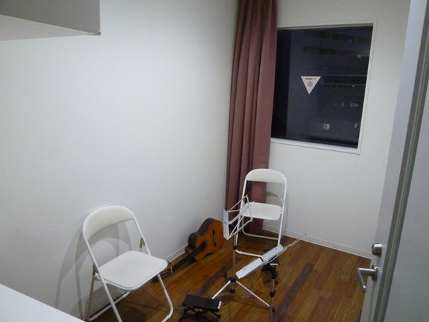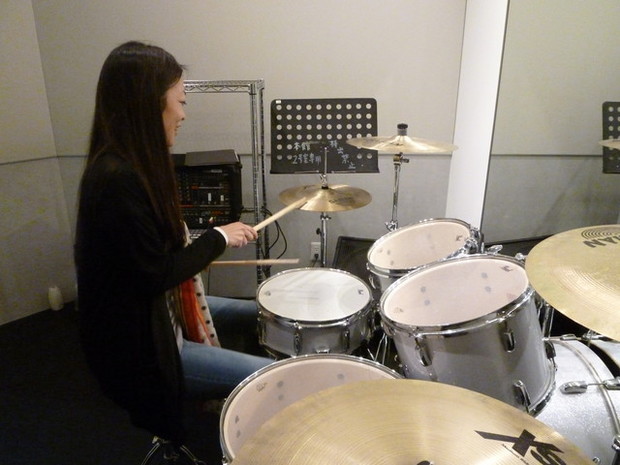 エレキギターやドラムの「個人練習室」。もちろん叩かせてもらいました