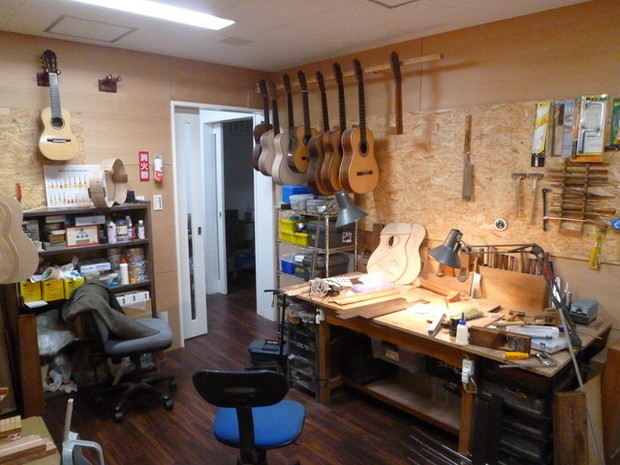実際にギターを制作している「制作実習室」では木の香りに包まれて