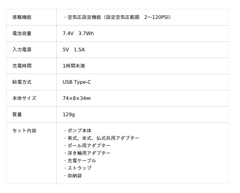 リチウムイオン充電池を内蔵し、USB Type-CでPCやモバイルバッテリーから手軽に充電可能。乾電池が不要なので環境にも優しく、ランニングコストを抑えられるのも家庭向けの大きな魅力です。フル充電で自転車タイヤ約3本分に対応可能(タイヤサイズ700x25C,80PSIでのテスト結果)。