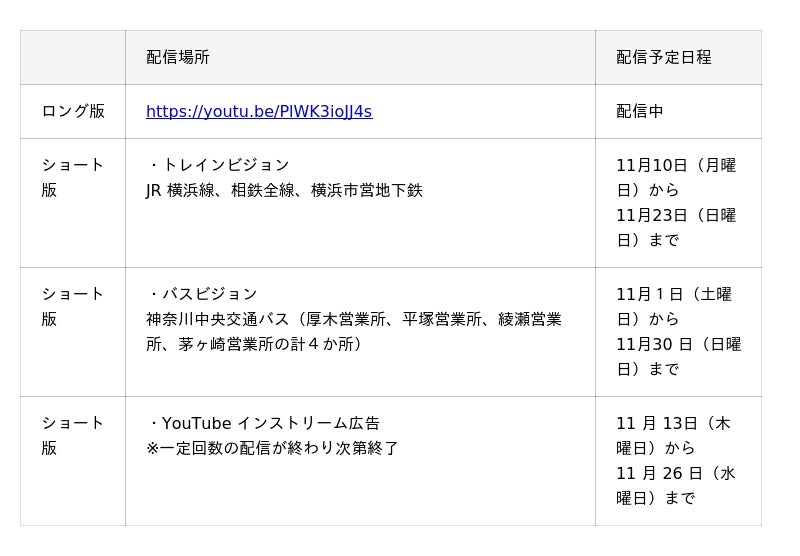 ロング版動画は、県公式 YouTubeチャンネル「かなチャンTV」で公開しています。そのほか県主催イベント等で広く活用していきます。また、ショート版動画は、トレインビジョンやバスビジョン、及び YouTubeインストリーム広告の配信に活用していきます。