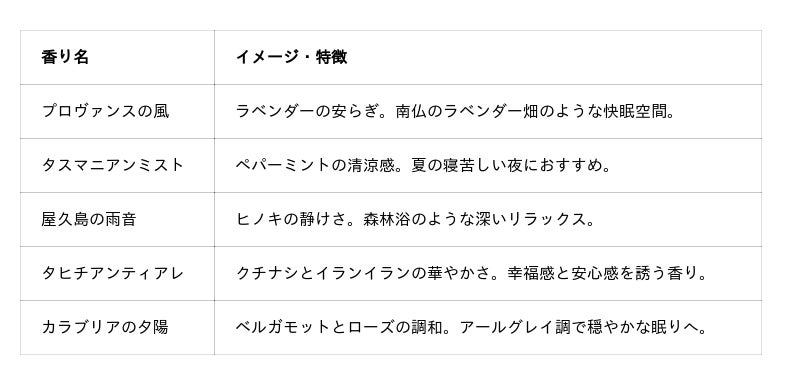 当社の「ぐっすりアロマ」※シリーズは、当社の日本有数の調香師が卓越した発想力と技術力で調香した特別なアロマです。世界のリゾート地をイメージした5種類の香りを、ピローミストとサシェで展開しており、心と身体をやさしく整え、眠りの質を高める空間演出を可能にします。寝室はもちろん、リビングや書斎など、就寝前の空間にもおすすめで、香りを記憶と結びつけることで、快眠習慣の定着にもつながります。