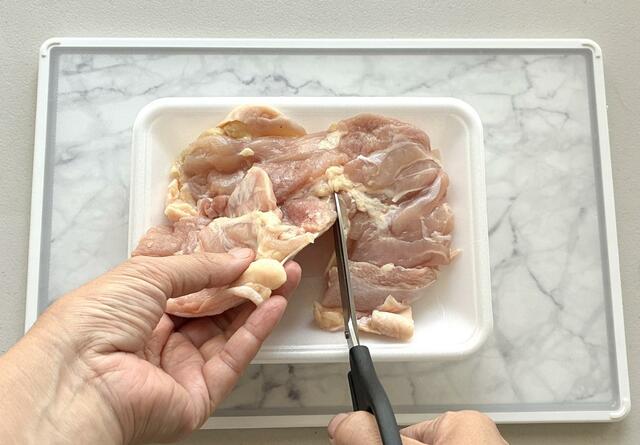 包丁でもキッチンバサミでも皮や脂が滑って切りにくい鶏もも肉も、このナイフならトレーの上で楽々切れました。