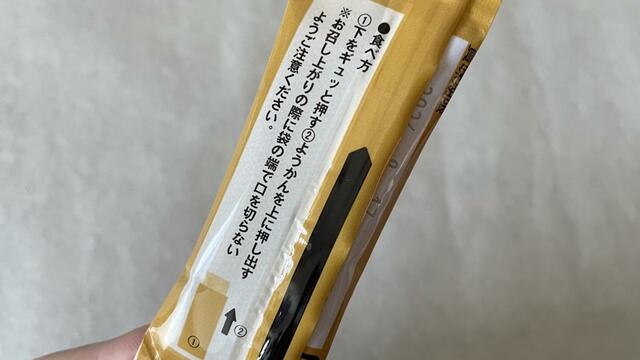 袋は切らずに、下をギュッと押してようかんを上に押し出してください。