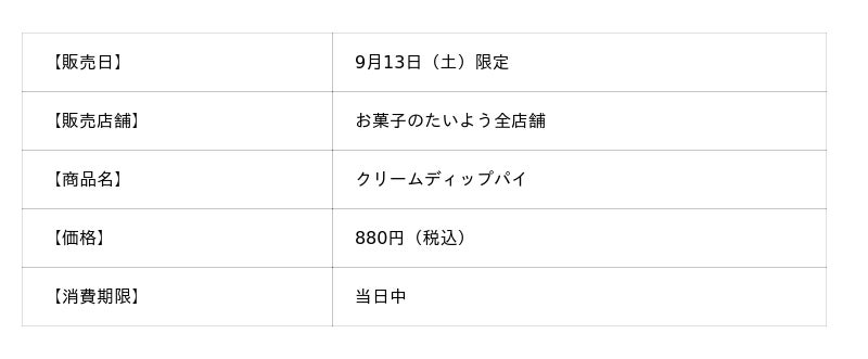株式会社太陽社(所在地:千葉県匝瑳市飯倉293、代表取締役:片岡正裕)が展開する、千葉県で長年愛され続ける菓子店「お菓子のたいよう」は、2025年秋の新作スイーツとして、「クリームディップパイ」を、2025年9月13日(土)一日限定で発売いたします。