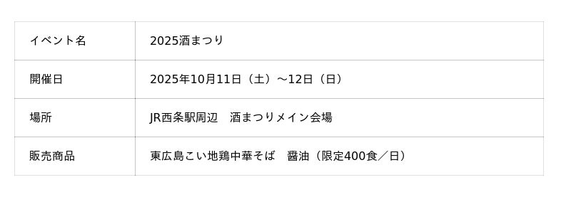 「2025酒まつり」での「東広島こい地鶏中華そば」販売に関する詳細は、東広島おでかけ観光サイト「ヒガシル」をご覧ください。