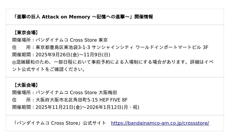 株式会社バンダイナムコエクスペリエンスは、TVアニメ『進撃の巨人』の世界観を体験できる期間限定イベント「進撃の巨人 Attack on Memory ~記憶への進撃~」を、2025年9月26日(金)から11月9日(日)まで東京・池袋にある体験型リテール施設「バンダイナムコ Cross Store 東京」で開催します。東京開催後は、2025年11月21日(金)から2026年1月12日(月・祝)まで大阪でも開催します。