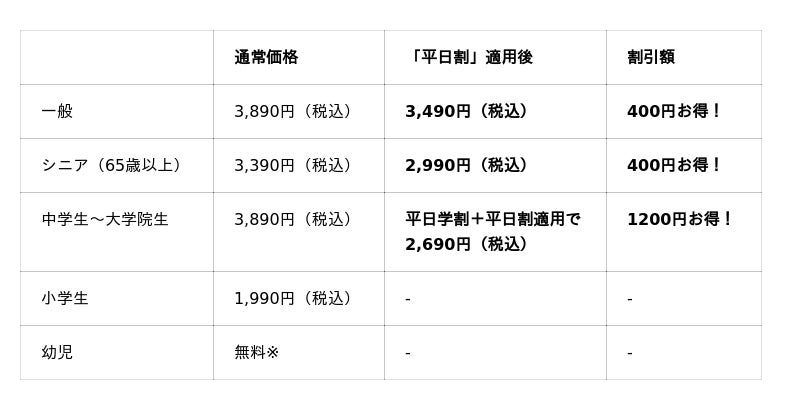 一般:3,890円(税込)⇒「平日割」と「平日学割」適用で2,690円(税込)