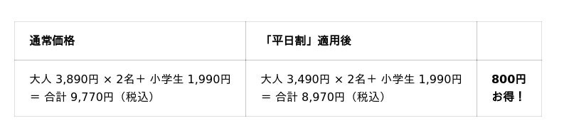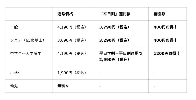 一般:4,190円(税込)⇒「平日割」と「平日学割」適用で2,990円(税込)