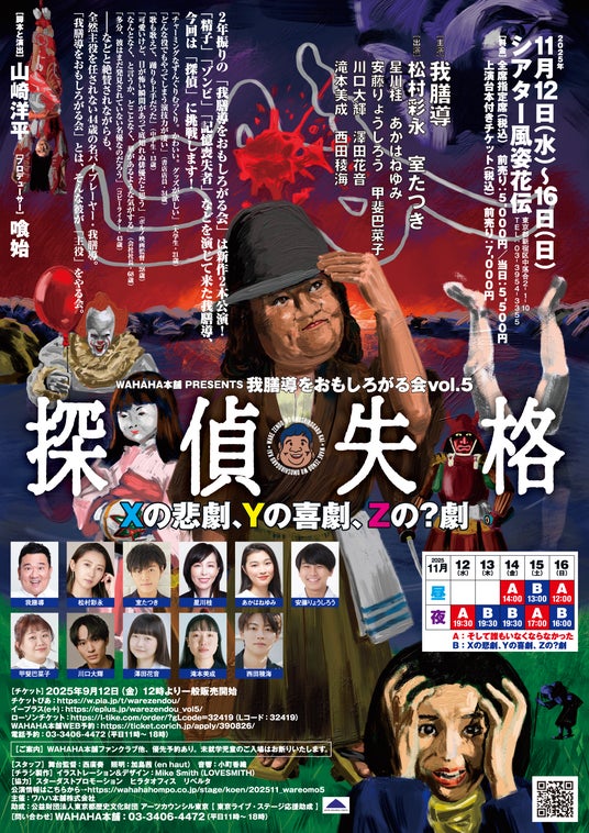 WAHAHA本舗株式会社主催、我膳導をおもしろがる会vol.5『探偵失格』<そして誰もいなくならなかった> /< Xの悲劇、Yの喜劇、Zの?劇>が2025年11月12日 (水) ~ 2025年11月16日 (日)にシアター風姿花伝(東京都 新宿区 中落合 2-1-10)にて上演されます。 チケットはカンフェティ(運営:ロングランプランニング株式会社、東京都新宿区、代表取締役:榑松 大剛)にて発売中です。