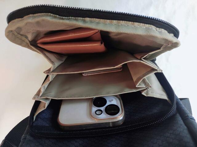 ポケットの中には2つの仕切りがあり、携帯などの小物を入れることができます。