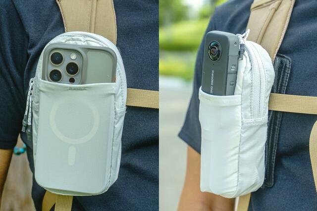 伸縮性のあるフロントポケットは、スマホやウェブカメラを入れても安定感があり、旅行先で歩きながら動画を撮るときなどにも役立ちそうです。