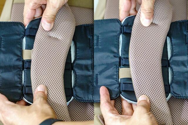 もうひとつは、大きなマジックテープ式の固定ベルト。複数箇所を留める必要がなく、ワンタッチで装着できてしっかり固定してくれます。