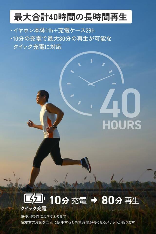 バッテリー性能も申し分なく、本体のみで最大11時間※の連続再生が可能。充電ケースと合わせると最大40時間※という驚異的な長時間再生を実現。10分の充電で最大80分※再生できるクイック充電にも対応しています(※使用条件により変わります)。