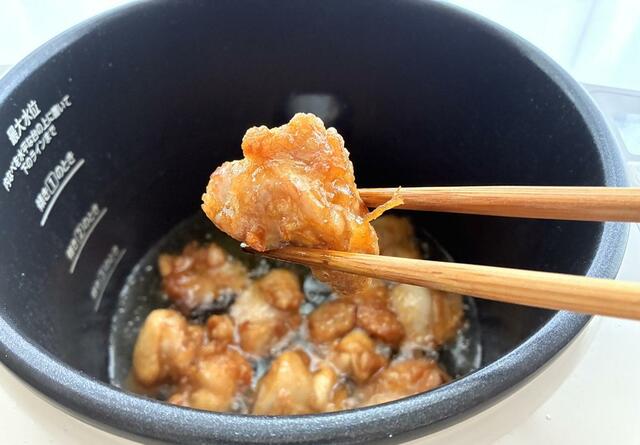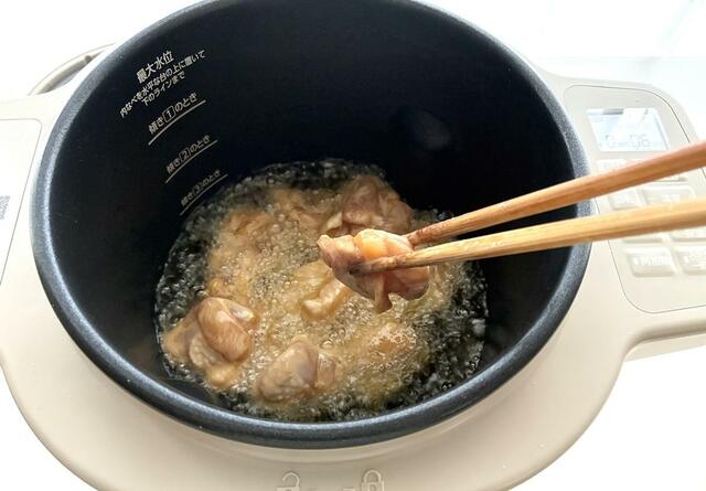 シェフドラムで作ると豚肉は揚げずに鍋が低温のところからじっくり火を入れるのでお肉が柔らかくてジューシーな仕上がりになります。