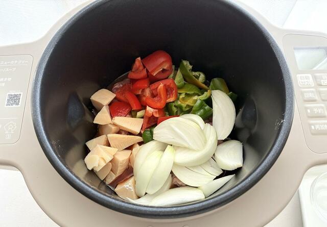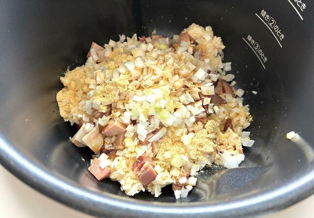 内鍋に油を馴染ませ、ご飯、具材、調味料の順に入れて、傾きを最大にしてセット。