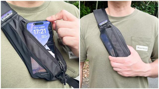 このバッグは取り出しやすい胸の位置にスマホ用のポケットを搭載しており、iPhone15(6.1インチ)も余裕で収まりました。