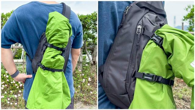 さらに、外側にはバックル付きのストラップも備わっているので、脱いだジャケットなどをぶら下げておくことも可能。