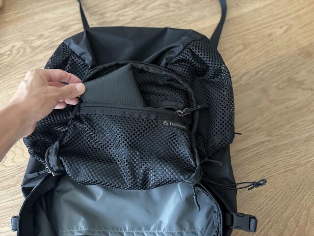 トレイルでは濡れたレンウェアを入れておけますし、筆者はすぐに取り出したいポーチ類やサングラス、上着などを入れています。