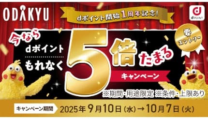 同キャンペーンでは、事前にキャンペーンサイトにてエントリーした上で(エントリー期間は10月7日まで)、対象の小田急百貨店において会計の際にdポイントカードを提示して1ポイント以上貯めると、もれなく通常の5倍のdポイント(期間・用途限定)が付与される。