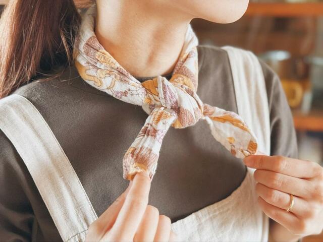 シンプルな服装のポイントになったり、差し色になってかわいいんです。首にきゅっと巻くと、ちょっと気合いが入り、気分もあがります。